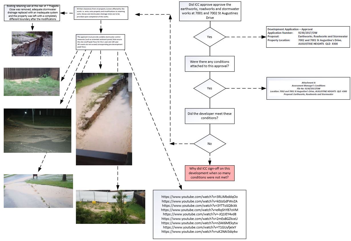 ICC attempted to cover-up the ‘strict conditions’ applicable to the original development application, highlighted in the ICC document ‘Augustine Heights development approved with strict conditions.’ Council restricted access to this document after the developer flooded the downstream estate neighbourhood a second time.