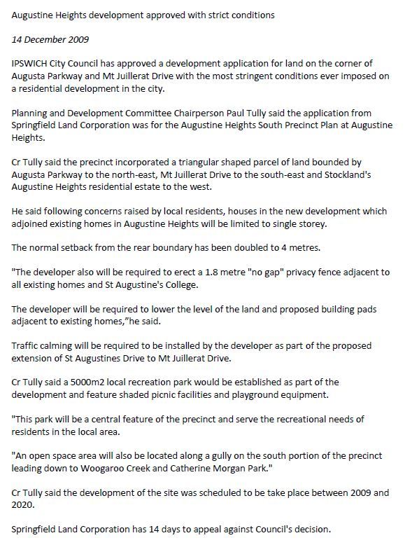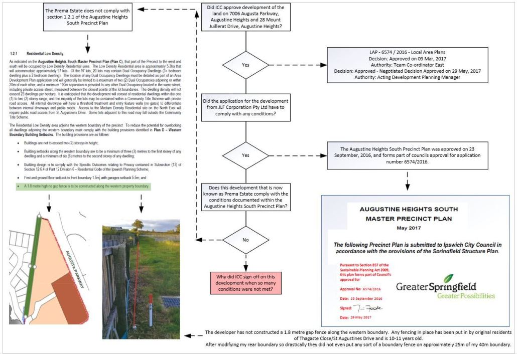 In his role as Planning and Development Committee Chairperson, Councillor Paul Tully proudly announced the approval with conditions that would have protected both existing residents on the border on the new estate, and investors in the new estate. Inexplicably, Springfield Land Corporation made Ipswich City Council remove a number of conditions, despite knowing it would immediately make the new development non-compliant with the privacy requirements documented within the Ipswich Planning Scheme (Division 6 - Residential Code). As it transpires, not only is the development that became Prema Estate not compliant with this condition of the Ipswich Planning Scheme, the poor design and development of the site has left my property at a heightened risk of flooding and runoff, as has been proven repeatedly.