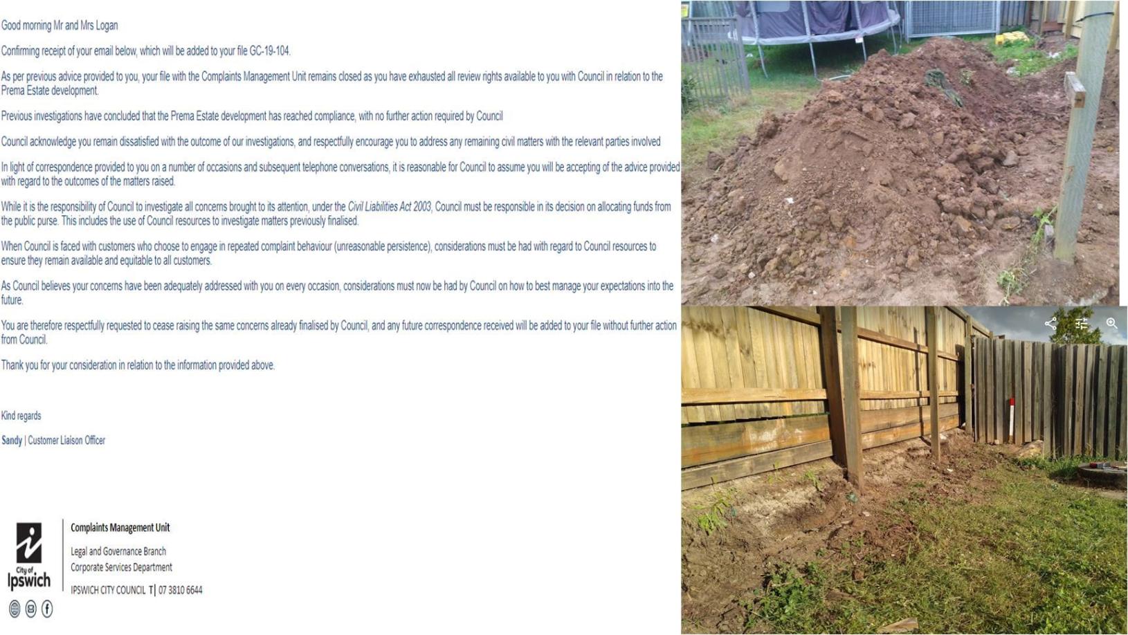 And unfortunately the Complaints Management Unit within the organisation did nothing to investigate or assist with any of my complaints, despite their false claims of doing so. The image below shows the fill that the developer dumped onto my property, this was one of the complaints they never investigated, as was the fence shown with the exposed footings. This used to be retained by a fence well inside the boundary. Council did actually respond to the complaint of my fence being used to retain this property eighteen months after it was lodged, long after I had removed the fence.. They only did this to be shown to not ignore complaints to the ombudsman.